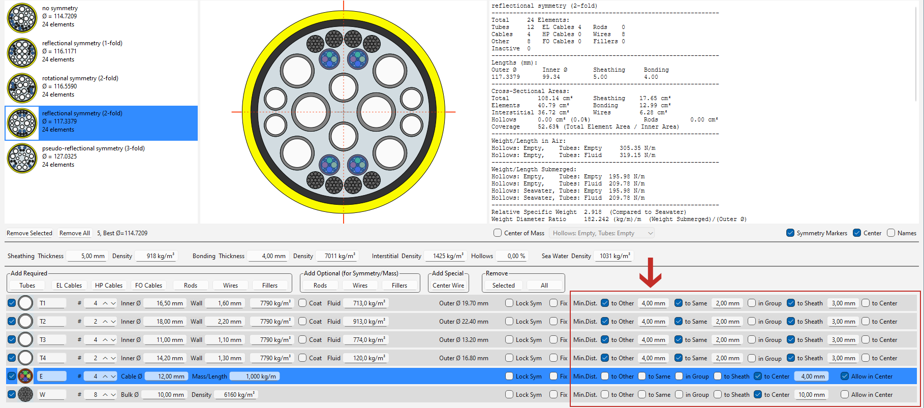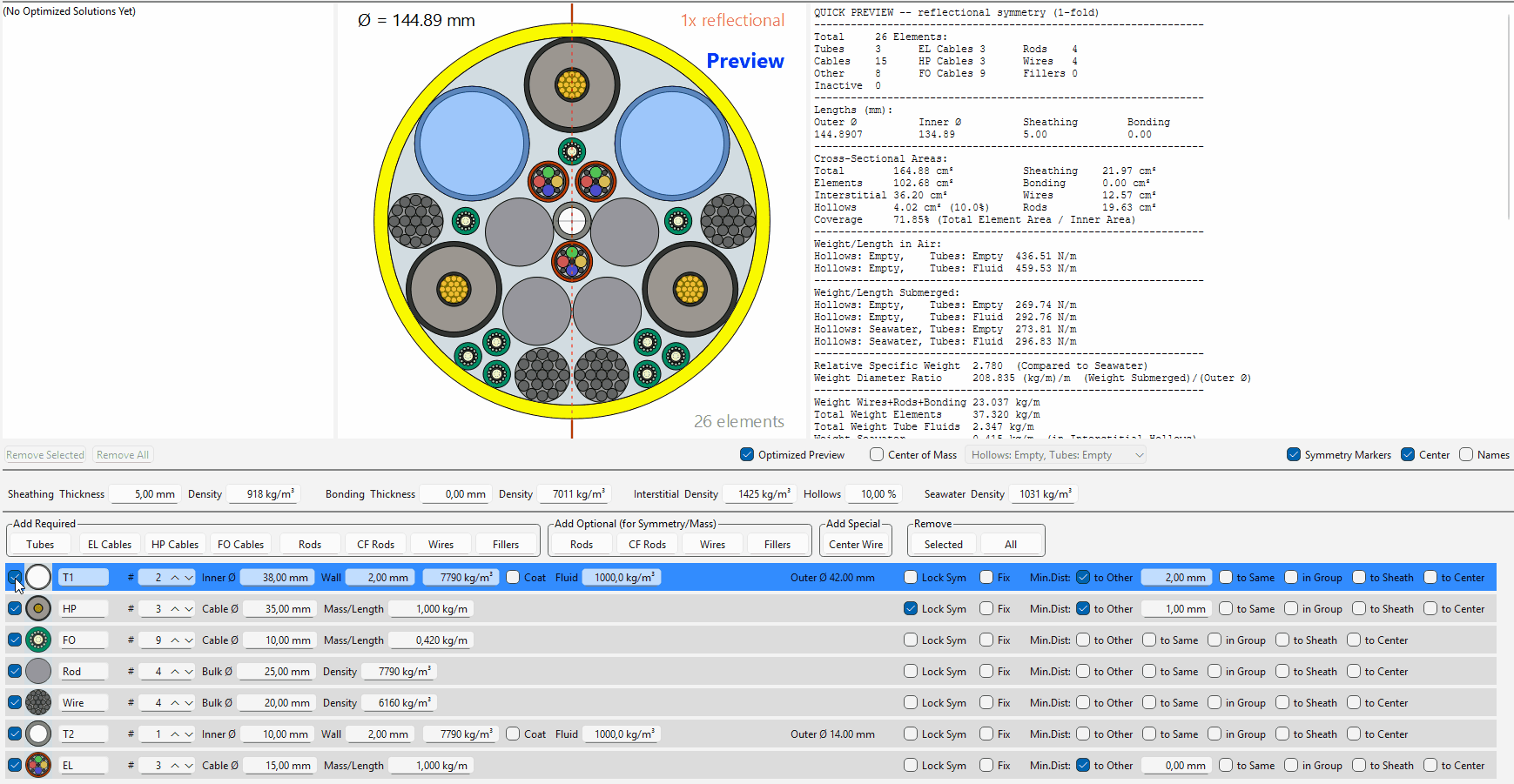 Optional rods, wires or fillers can be used by the solver to create more symmetric layouts and/or optimize the umbilical's mass (specific weight or weight to diameter ratio).
